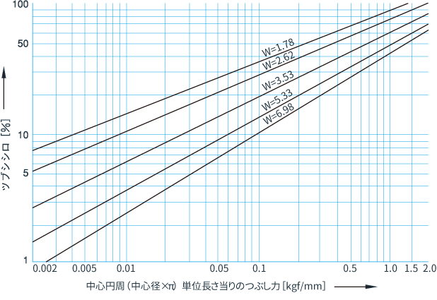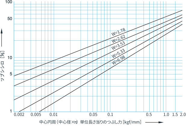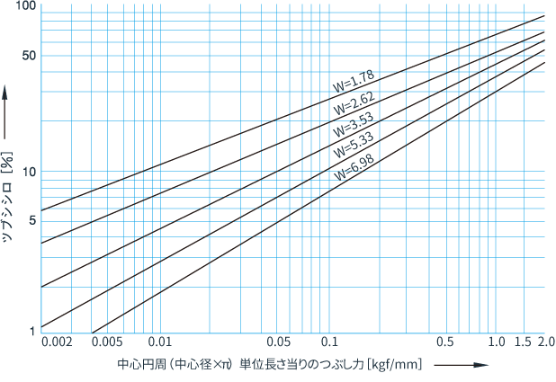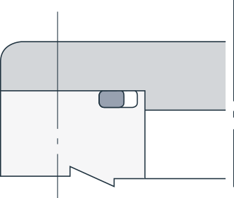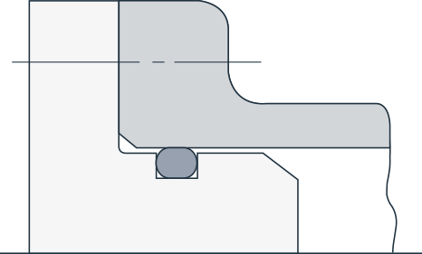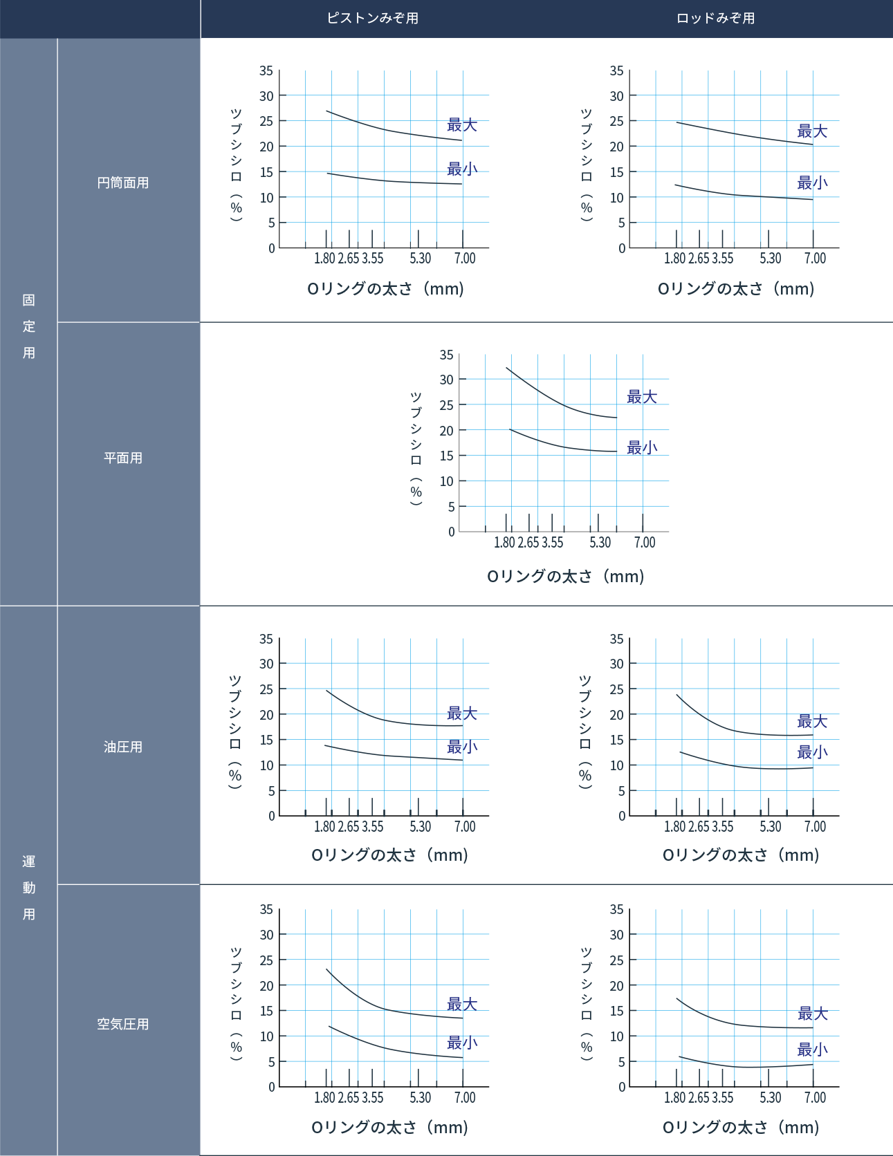 運動用にOリングを使用する場合のツブシシロは、密封効果、摺動抵抗、圧縮永久歪などに大きく影響しますので、必要最小限に抑えなければなりません。運動用でとくにスピードが速い場合や潤滑条件が悪い場合などには、ツブシシロを一般の運動用Oリングよりさらに小さめにしてください。 固定用の使用方法には図3のような径方向に圧縮する円筒面固定用と、図4のような径方向と直角方向に圧縮する平面(フランジ)固定用とに分けられます。円筒面固定用に使用する場合、一般に運動用Oリングと同ようなツブシシロをとります。平面固定用の場合はボルトの伸び、フランジ面の歪によるツブシシロの減少を考慮して運動用、円筒面固定用よりツブシシロを大きくする必要があります。図5に用途別のOリングのツブシシロを示します。【図3】 円筒面固定用