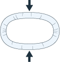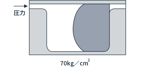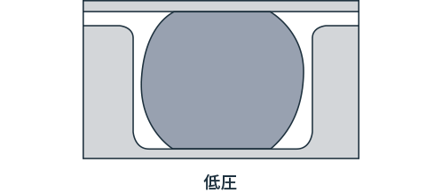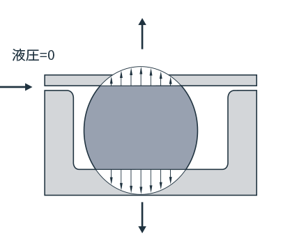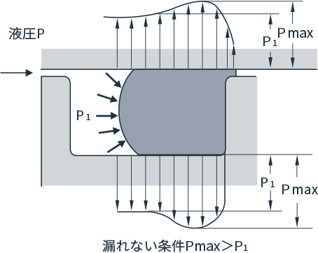 Oリングはみぞ内に装着されたとき、みぞの深さがOリングの太さより小さいので、Oリングは(Oリングの太さマイナスみぞ深さ)つぶされます。この圧縮量をツブシシロといいます。微圧力においては、図1に示すようにOリング自身のゴム弾性によって、シール作用が行われます。片側から液圧がかかると、図2に示すように負荷液圧より高い反力が生じます。これをOリングの自封作用といいます。【図1】 取付け時反力