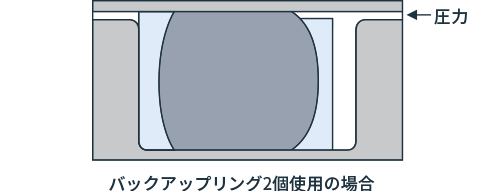 Oリングに高圧がかかると、スキマからハミ出しを生じます。このハミ出しを防止するためにバックアップリングを使用します。バックアップリングは両方から圧力のかかる場合、Oリングの両側に装着し、一方向から圧力のかかる場合、図7-1のように圧力と反対側に1個装着します。スペースに余裕があるときには、図7-2のように一方向の圧力でも2個使用することをおすすめします。材料は、種々の合成樹脂が用いられますが、一般にはテフロン(四フッ化エチレン樹脂)が使用されています。バックアップリングの形状にはエンドレス、バイアスカット、スパイラルの3種類があり、使用上の効果は、エンドレスが最も優れ、装着の点ではバイアスカット、スパイラルが便利です。