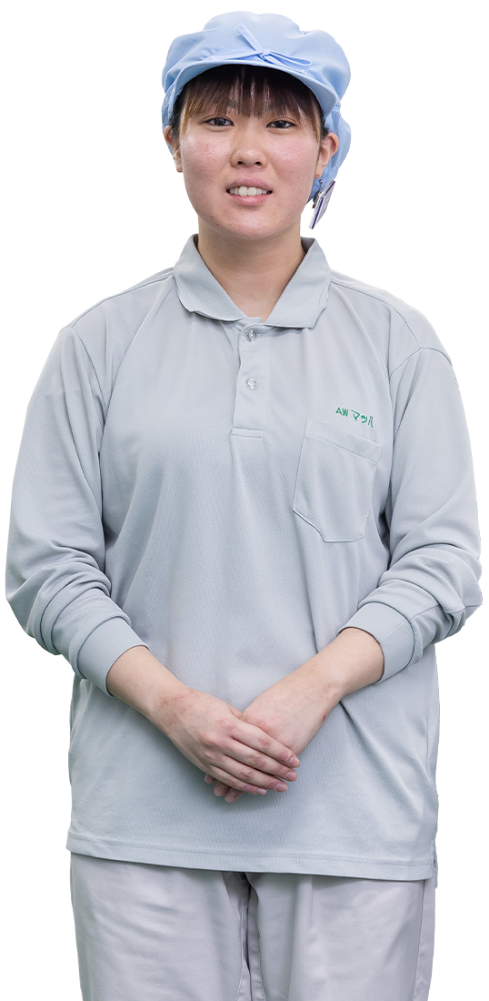 就職を考えていた企業見学の際、職場のみなさんからの気軽な挨拶や優しい言葉がけに、明るく働きやすい印象を受けました。各工程が連携し、製品が作られる様子を見て、私も貢献したいと思い、入社を希望しました。 入社後は検査のほか、ゴム製品の性能を高める二次加硫工程などの研修を経て、現在の包装工程に携わっています。当初は専門用語など知識不足から戸惑うことばかりでしたが、職場は第一印象と同じく明るい雰囲気。分からないことはすぐに相談しています。