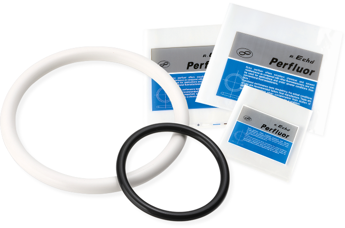 エコーパーフロはエア・ウォーター・マッハが独自開発した超高性能フッ素ゴムであり、従来のフッ素ゴムの特性を保持しつつ、且つ従来ゴムでは不可能と考えられていた有機極性溶剤、各種薬品*、酸、アルカリの過酷な条件下においてフッ素樹脂(テフロン)とほぼ同程度の使用が可能となった画期的な特殊合成ゴムです。
