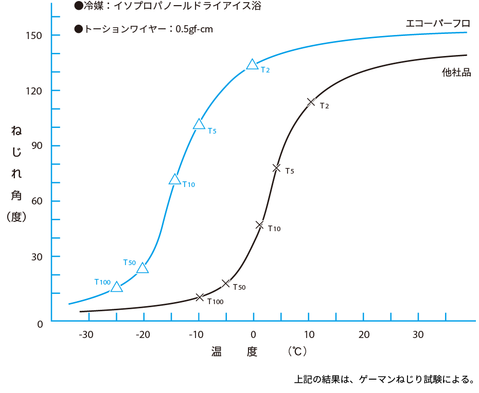 ゲーマン低温ねじり試験の結果は他社製品と比べ、かなり低温域までゴム弾性を維持しています。